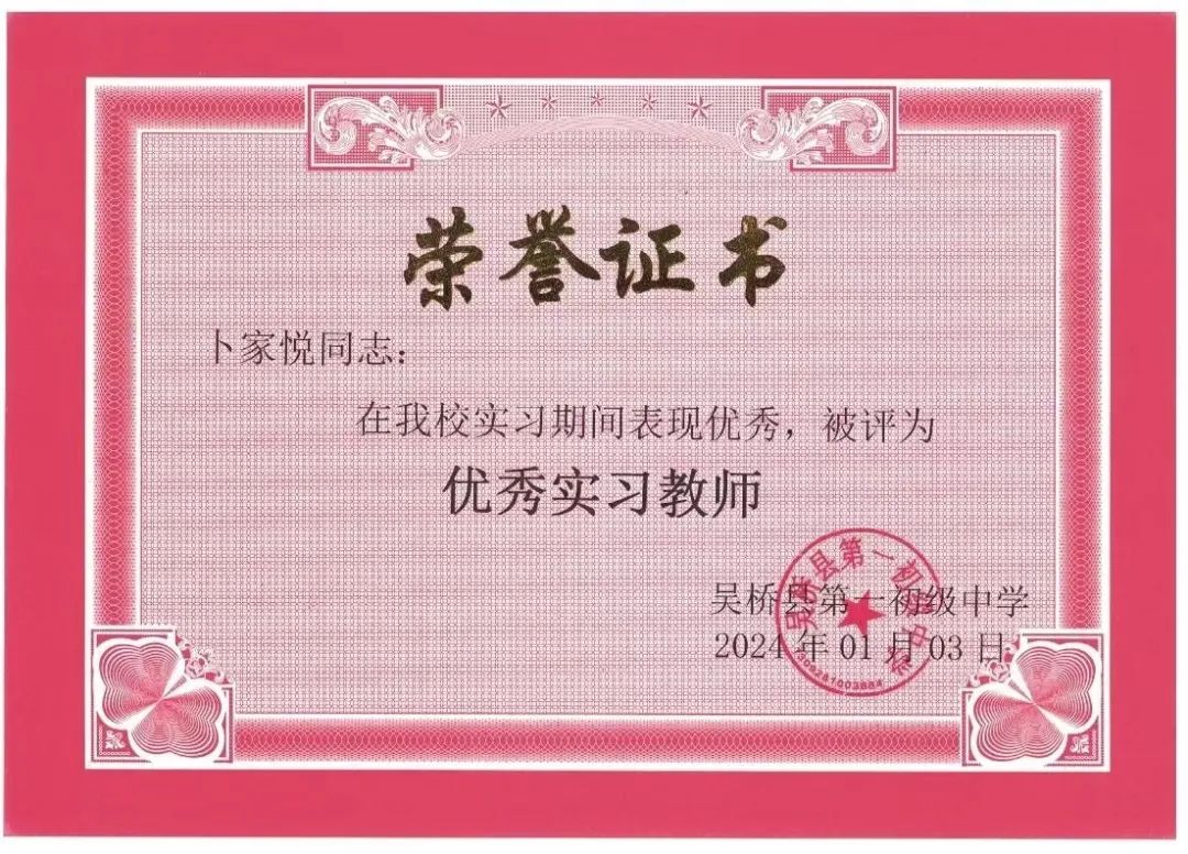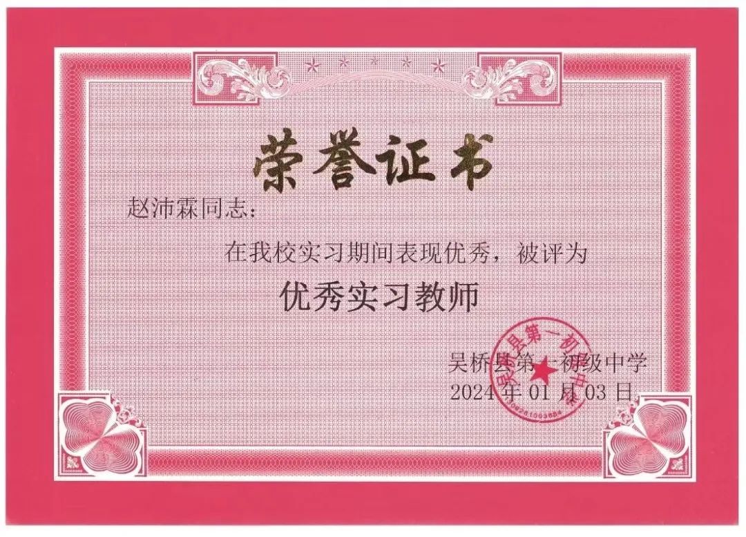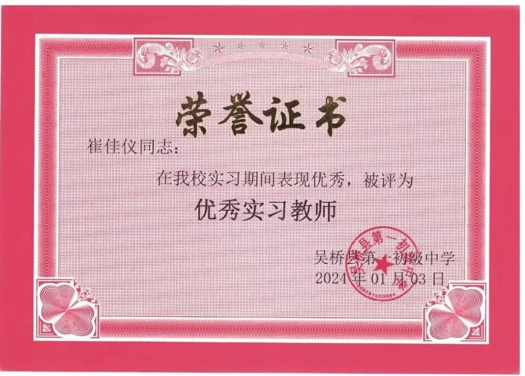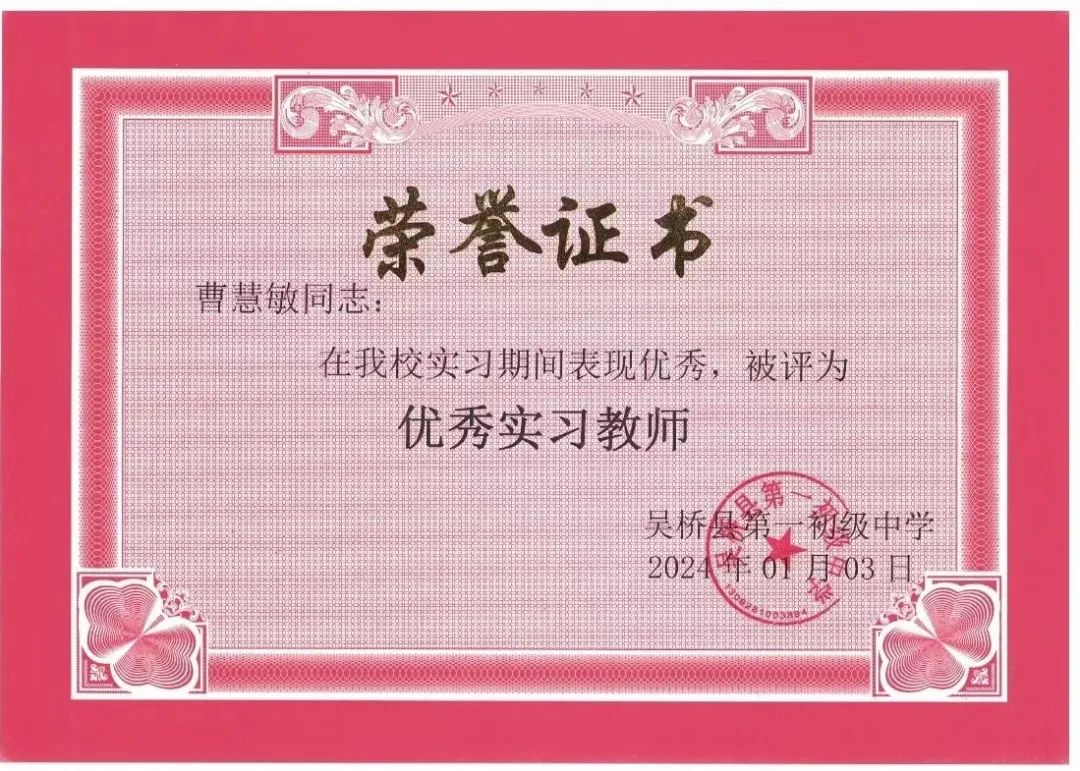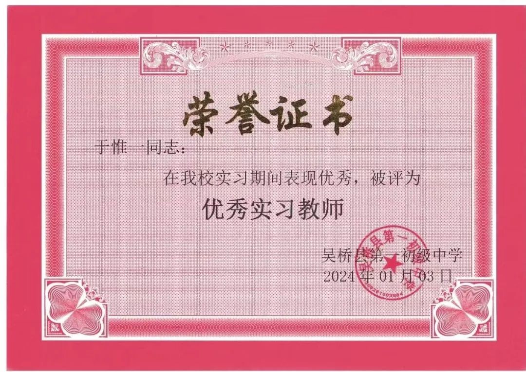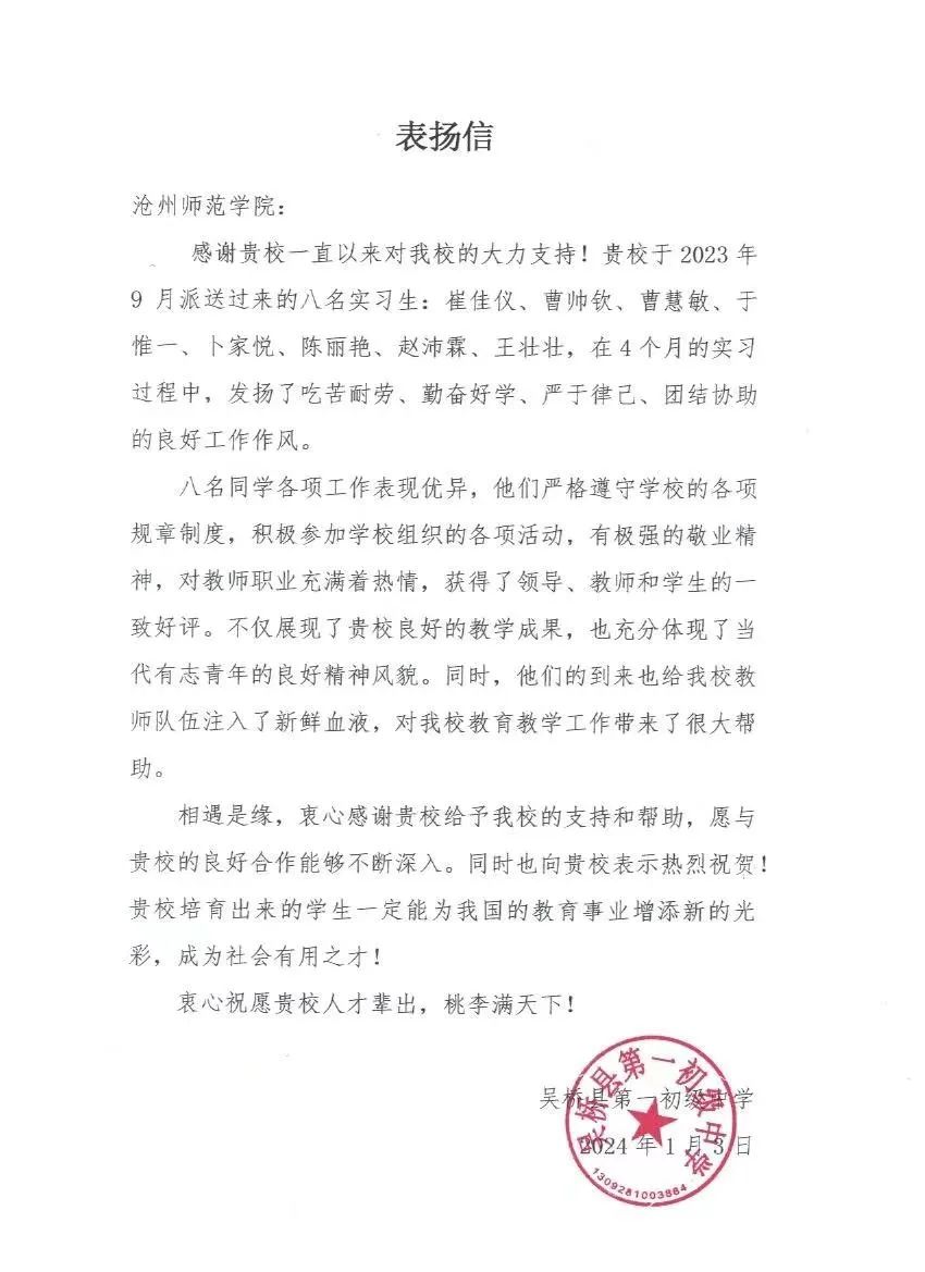 1月7日,吴桥县第一初级中学校长李世芳、副校长周霞向opta官网专门寄达一封表扬信和八张“优秀实习生”荣誉证书,对opta官网派驻的全体八名实习生给以表扬。