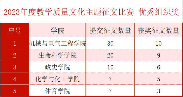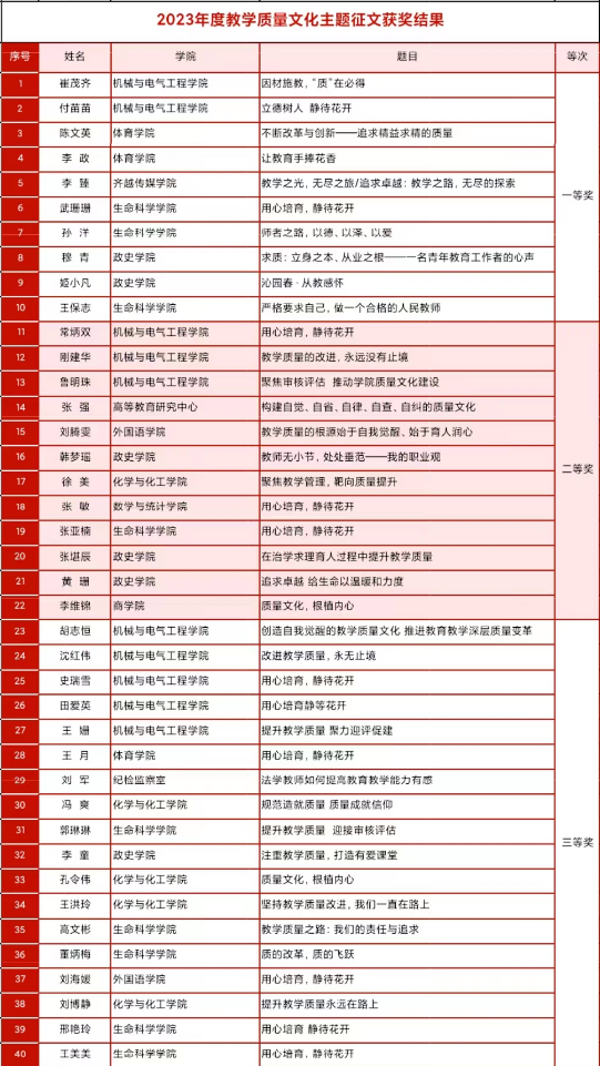 2023年度教学质量文化主题征文比赛结果出炉啦!本次比赛是2023年度教学质量文化月重要宣传活动。截止12月中旬共征集到作品91篇。经过评审委员会的严格评审,最终评选出一等奖10篇、二等奖12篇、三等奖18篇。