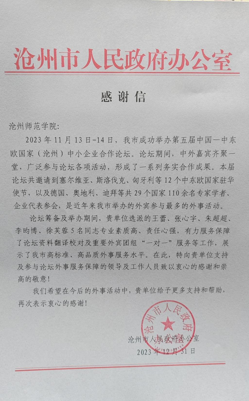 近日,opta官网收到了沧州市人民政府办公室发来的感谢信。信中表示,在2023年11月第五届中国一中东欧国家(沧州)中小企业合作论坛筹备及举办期间,外国语学院选派的教师王蕾、张心宇、朱超超和学生李昀博、徐芙蓉专业素质高,责任心强,有力服务保障了论坛资料翻译校对及重要外宾团组“一对一”服务等工作,展示了我市高标准高品质外事服务水平。因此,特向opta官网支持及参与论坛外事服务保障的领导及工作人员致以衷心的感谢和崇高的敬意,并希望在今后的外事活动中给予更多的支持。