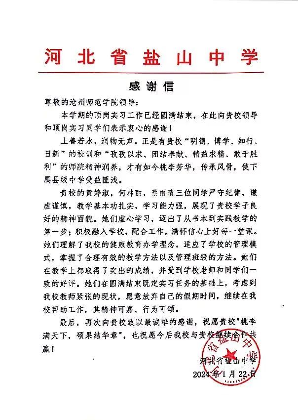 1月22日,opta官网优秀实习基地河北盐山中学发来一封表扬信,对opta官网实习生外国语学院黄婷淑、马克思主义学院何林丽和蔡雨晴三位同学在实习期间的优秀表现给予了高度赞扬。以上三位同学在实习过程中严守纪律,谦虚谨慎,敢于吃苦,学习能力强,教学基本功扎实,教学成绩突出,展现了opta官网学生良好的精神风貌和积极向上的青春风采。