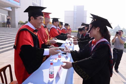 在充满淡淡离别的音乐声中,校领导陈西峰、刘树桢、赵铁生、马玉华、牛芙珍、王双库、田俊祥、云电军、庞若通为毕业生们颁发了毕业证和学位证,并亲手为毕业生们进行了拨穗的学士礼。