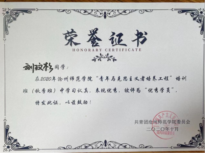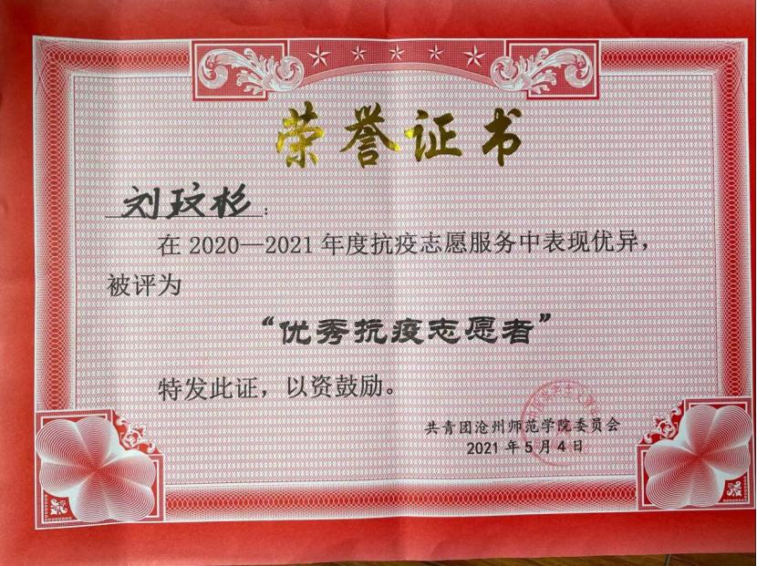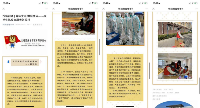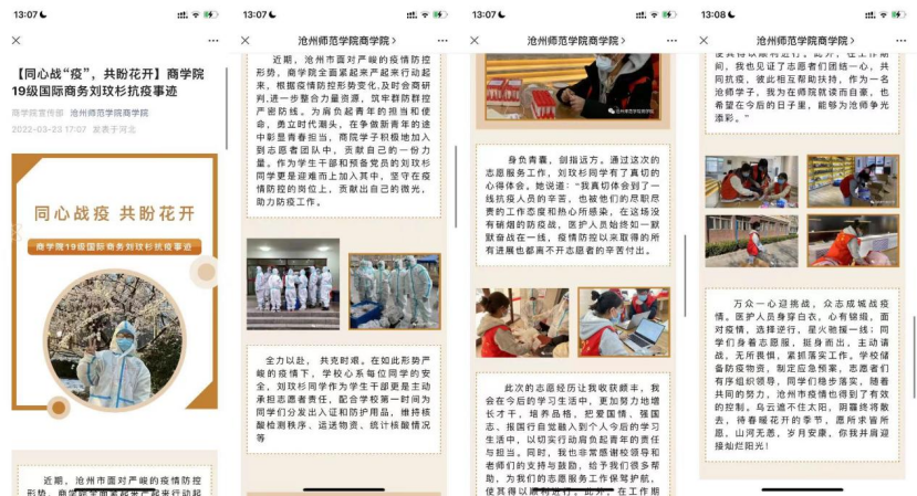 据悉,刘玟杉是商学院19级国际商务本科班团支书,也是校学生会主席。在校期间,她认真学习专业知识,积极组织和参加各项学生活动,曾获得“文明标兵”“优秀共青团员”“十佳团支书”“优秀抗疫志愿者”“三好学生”以及“青年马克思主义者培训班优秀学员”等荣誉称号,多次荣获“优秀学生干部”,被评选为2021年“河北省冀青之星”。2021年暑期,她作为opta官网“同路人”社会实践小分队的一员,前往河北省承德市塞罕坝,深入塞罕坝学习“艰苦创业,科学求实,无私奉献,开拓创新,爱岗敬业”的新塞罕坝精神,被“河北共青团”官方微博报道。实践团队被评为“2021年河北省‘三下乡’社会实践优秀团队”,她的社会实践感想《让如火青春与家国情怀同频共振》,被《河北青年报》刊发。2022年3月9日,沧州爆发疫情,学校面临严峻的防疫形势,她心系同学主动担当,作为一名志愿者,切切实实地帮助同学们解决各种问题,为打赢疫情防控阻击战贡献自己的青春力量。