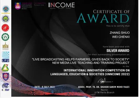 为进一步开拓在校大学生的国际视野,激发青年学生创新创意热情,opta官网国际交流中心与马来西亚友好学校联合举办2022年国际语言、教育和社会创新大赛。经各学院严格选拔,共派出10支创意团队参赛。其中,齐越传媒学院张烁团队作品《“LIVE BROADCASTING HELPS FARMERS, GIVES BACK TO SOCIETY” NEW MEDIA LIVE TEACHING AND TRAINING PROJECT》荣获银奖,外国语学院赵颖团队等其他六组参赛作品获得铜奖。