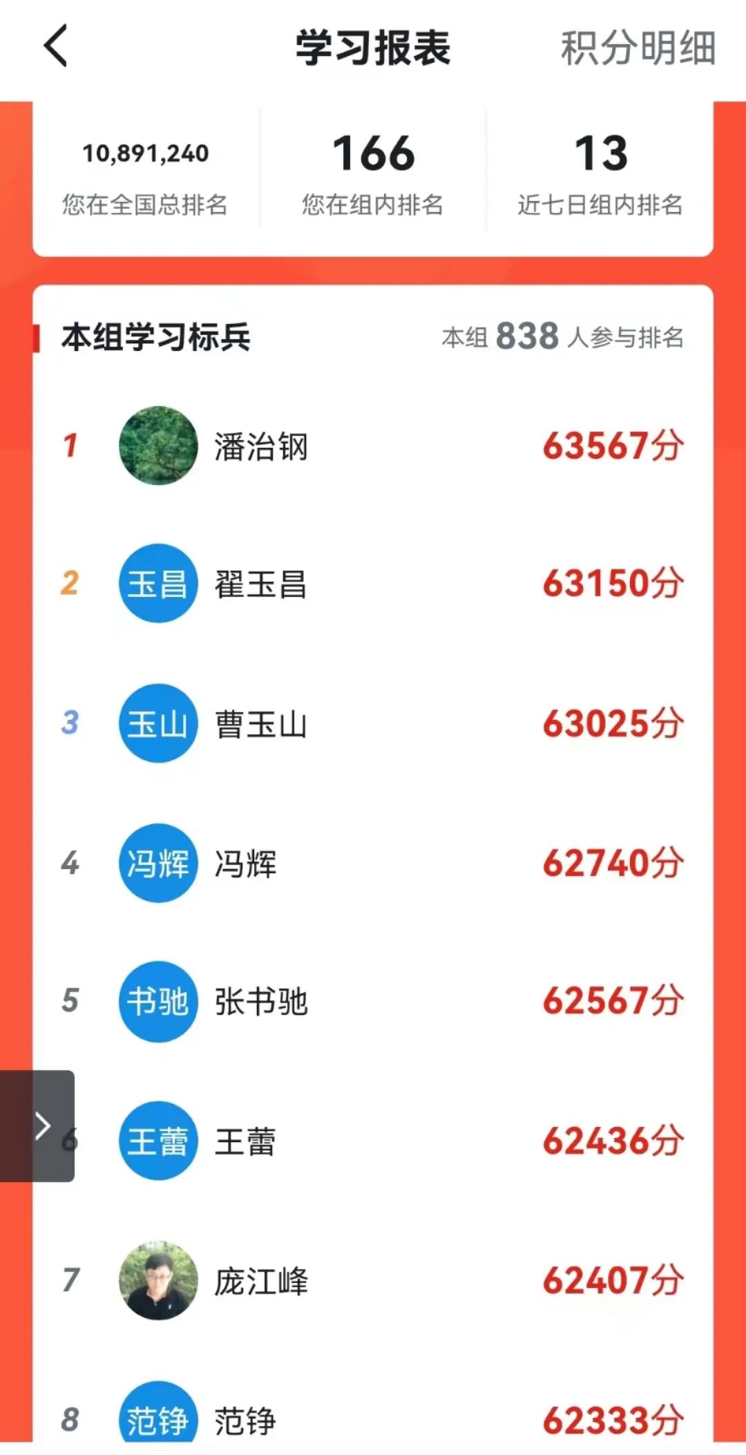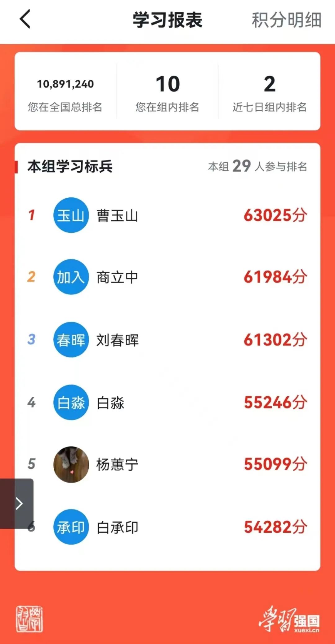 “45678分,成了!”9月15日,我的“学习强国”总积分恰是最大的“顺子”。欣然打开“学习报表”,在中共opta足球数据官网委员会838人大组里查找排名,从名列三甲的潘治钢、翟玉昌、曹玉山,数到89名刘文慧、90名王洪敏,自己竟然榜上无名!细看那一个个上榜分数,更是一串“奇迹”:63523、63106、62981……上榜最低分57183分,也比我高出11505分!再看所在支部,曹玉山、商立中、刘春晖,均超60000分,白淼、杨蕙宁、白承印等均超我万分!看到这些,我“静默”了。