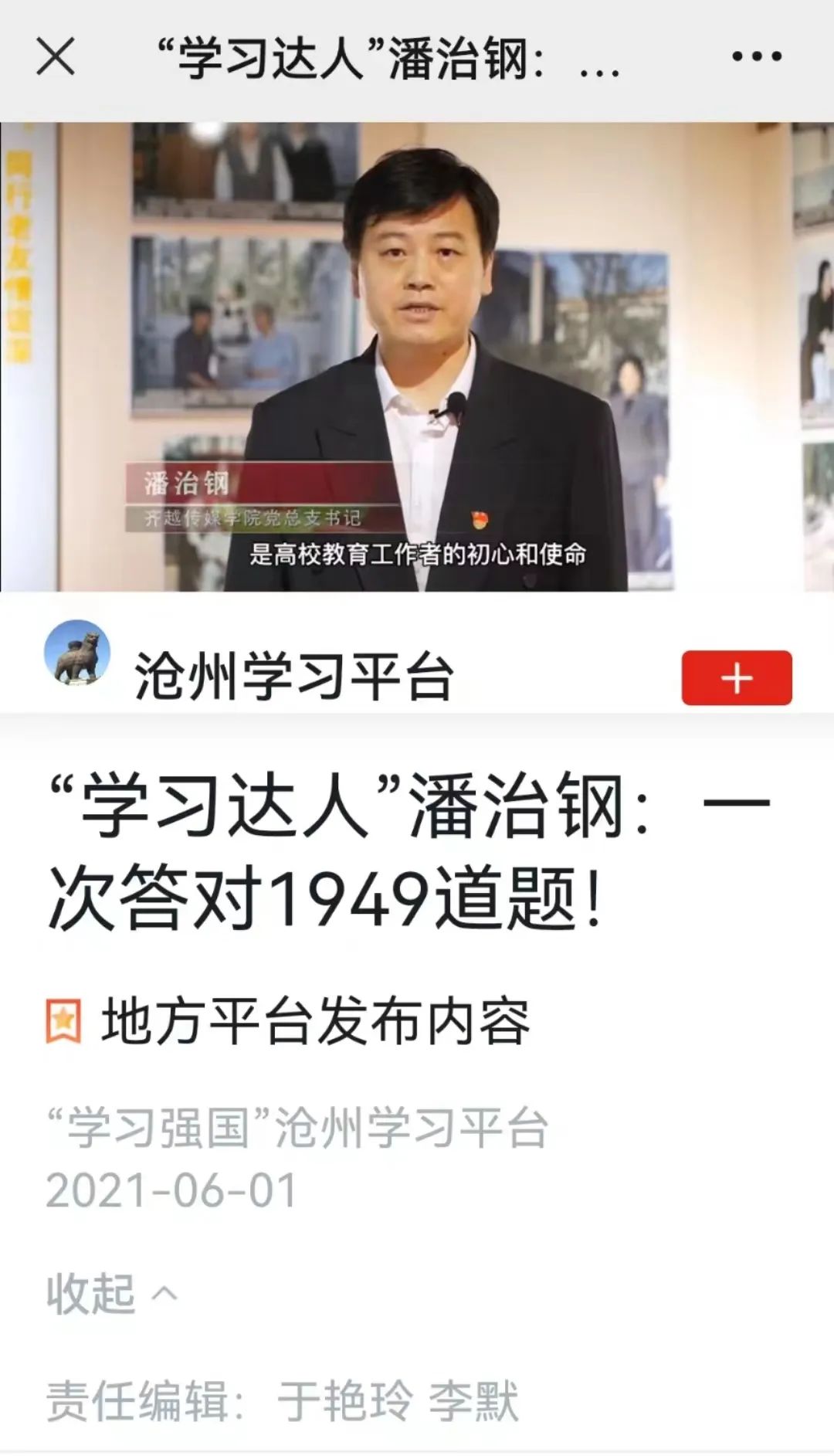 名列榜首的齐越传媒学院党总支书记潘治钢,堪称全校最亮的“学星”、最强的“达人”。从2019年3月起,潘治钢就开始了“学习”之旅。在经历了从“要我学”到“我要学”的升华后,“学习强国”已成为他生活的有机组成部分:每天早起,第一件事就是打开“学习强国”,边活动身体边收看昨天的《新闻联播》,闲暇再做各项“答题”。中午、晚上都在“学习强国”上看新闻,家里电视几乎成了摆设。睡前打开“学习积分”,查漏补缺,力争学满每日积分。通过“学习强国”,潘治钢在学生教育、管理、服务工作中,思想政治理论扎实,运用得心应手,他和院长带领学院获评学校科研先进单位、勤工助学先进单位。他本人也获评河北学习平台“学习达人”沧州市教育系统学习强国学习先进个人。