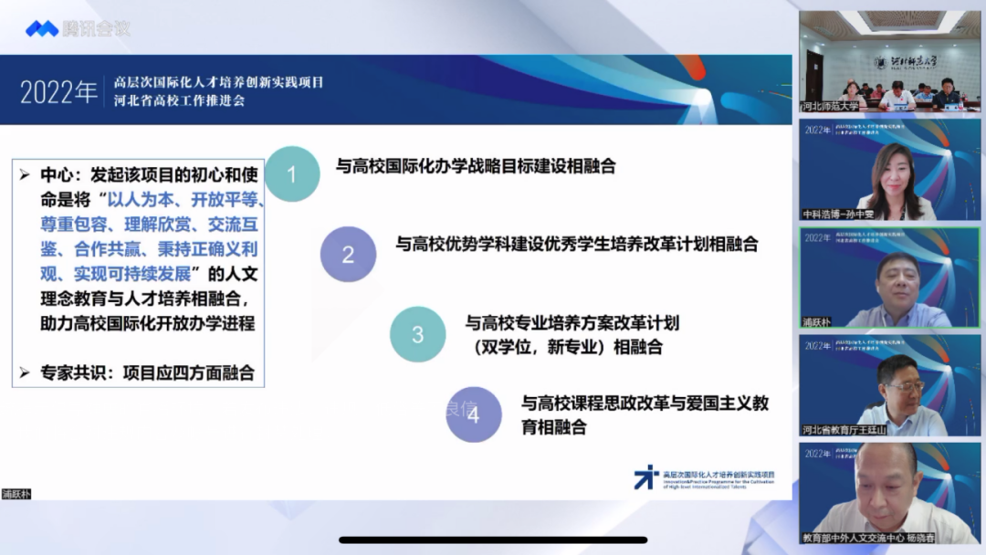 6月1日,由教育部中外人文交流中心主办的“2022年高层次国际化人才培养创新实践项目河北省高校工作推进会”成功召开。教育部中外人文交流中心副主任杨晓春、河北省教育厅一级巡视员王廷山、项目专家指导委员会主任浦跃朴、河北师范大学校长刘敬泽、燕山大学副校长陈国强、中科浩博国际教育创始人兼CEO孙中雯出席会议并讲话。河北省教育厅及省内30所高校的110余位学校领导和部门负责人相聚云端、共商大计。opta官网副校长高颖与国际交流中心负责人全程线上参会。